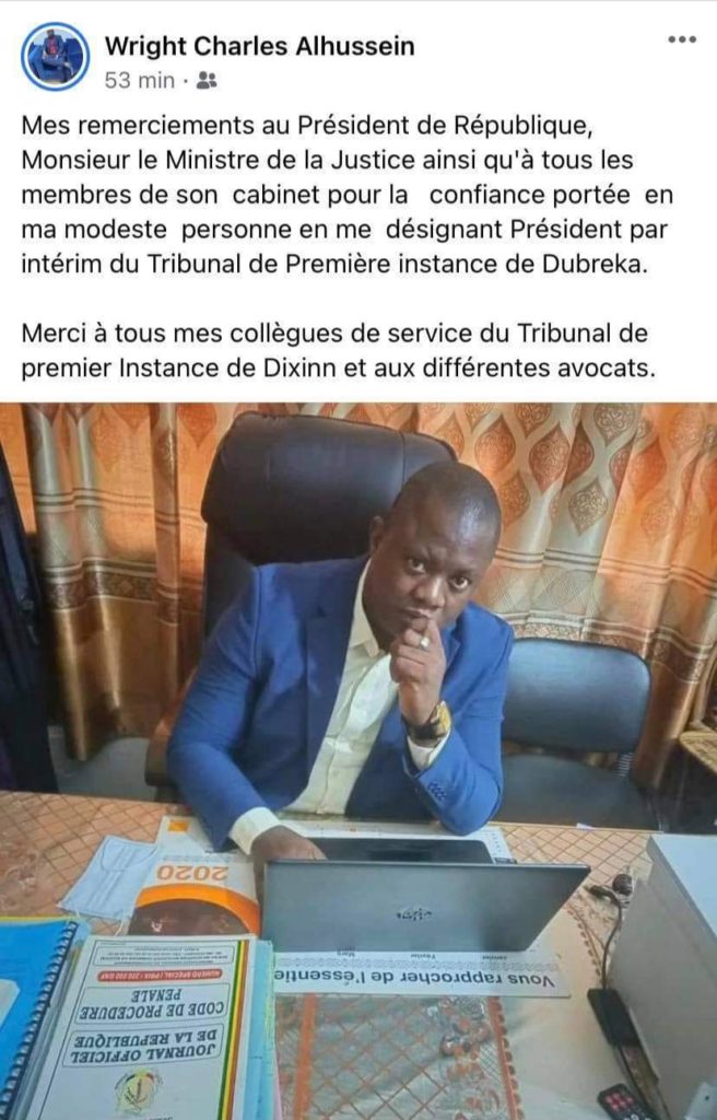 Le juge Alphonse Charles Wright, jusque-là en service au TPI de Dixinn, qui a osé rendre des jugements en faveur des détenus politiques et autres militants du FNDC, vient d’annoncer, à travers un tweet, sa mutation pour Dubréka. Il assurera désormais la présidence par intérim du Tribunal de Première Instance de cette localité.